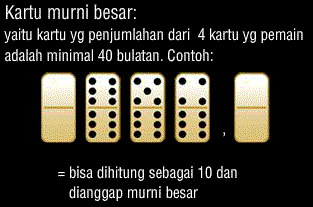 - Jika total bulatan pada 2 kartu lebih dari 9, maka nilai kartu dikurangi 10.